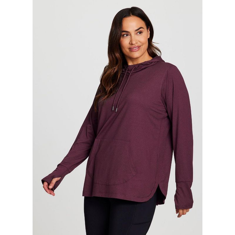 RBX Active Women's Legging Friendly Buttery Soft Stretch Jersey Adjustable Hood Long Sleeve Top with Thumbholes, Pocket - Burgundy,3X