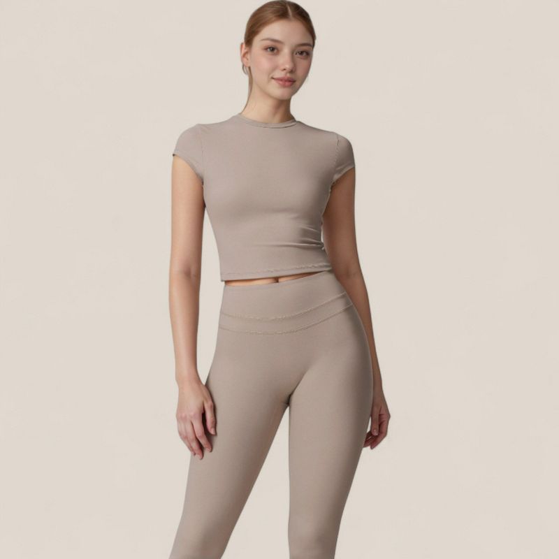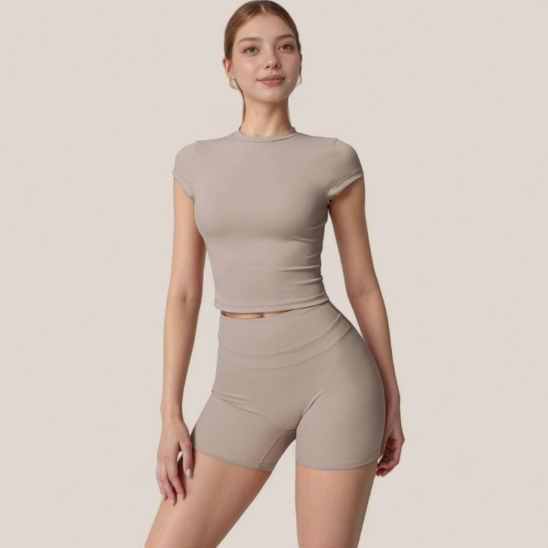 Anna-Kaci Active Women's Fitted Crop Active Tee Short Sleeve Round Neck Stretch Performance Fabric - Small, Beige