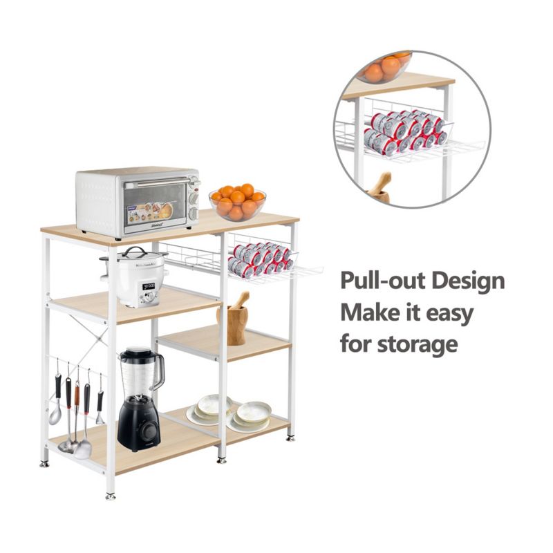 SEVOBAL Kitchen Storage 3 Tier White Oak Bakers Rack with Basket and Hooks for Microwave Stand and Organization, White, 38.98"*17.91"*5.12"