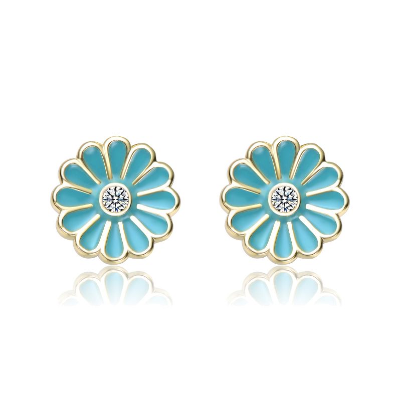 Guili Kids 14k Gold Plated Clear Cubic Zirconia & Blue Enamel Flower Stud Earrings, Charming Floral Design for Everyday Wear and Special Occasions