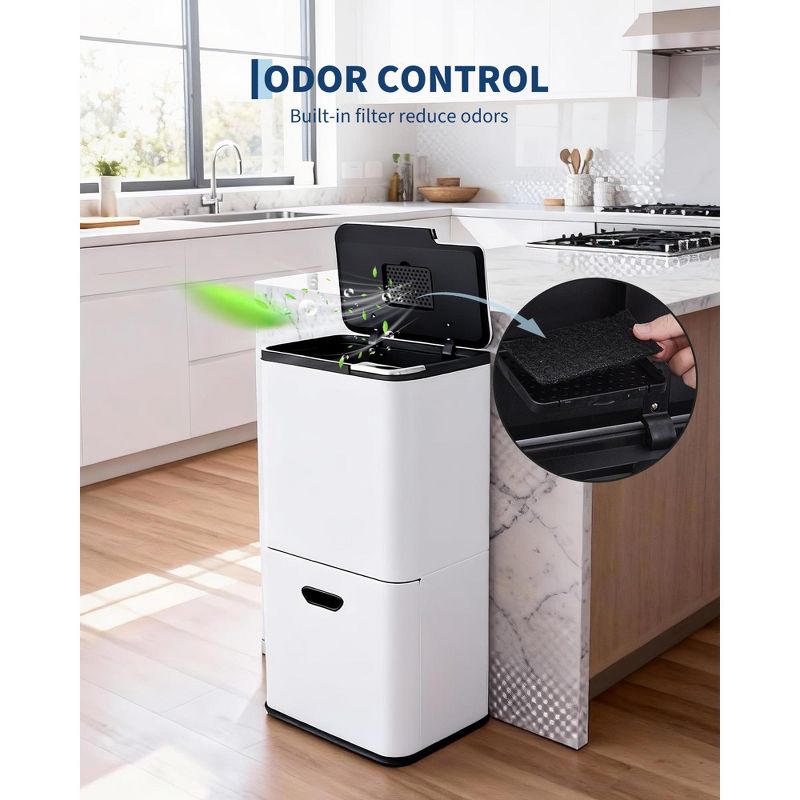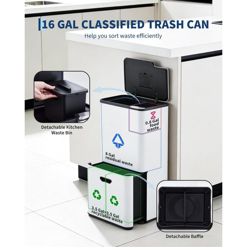 Trash Can, Recycling Bin – 16 Gallon Dual Compartment Stainless Steel Kitchen Garbage Bin with Removable Buckets Odor Control Pull-Out Wheels