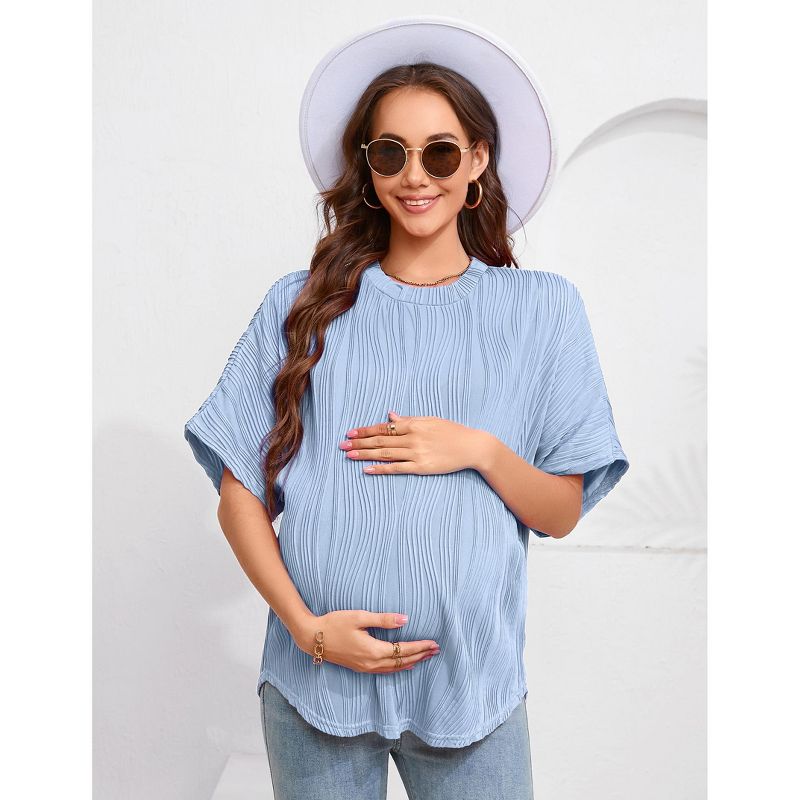 Garvee Womens Maternity Shirts Summer Ribbed knit Short Sleeve Casual Pregnancy Clothes Crewneck Loose Maternity Tops LightBlue X-Large