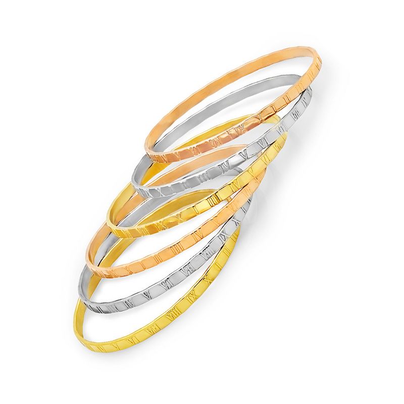 Steeltime Ladies set of 6 stainless steel, 18k gold plated stainless steel, and 18k rose gold plated stainless steel bangle with roman numeral accent