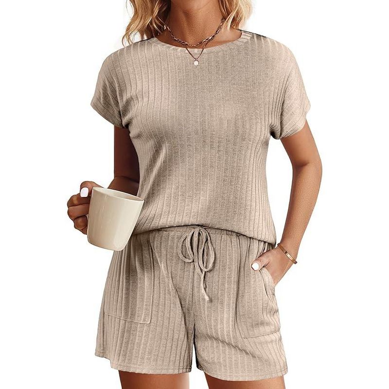 Ekouaer Pajamas Set for Women 2 Piece Pjs Ribbed Knit Lounge Set Cap Sleeve Loungewear Sleepwear Black M