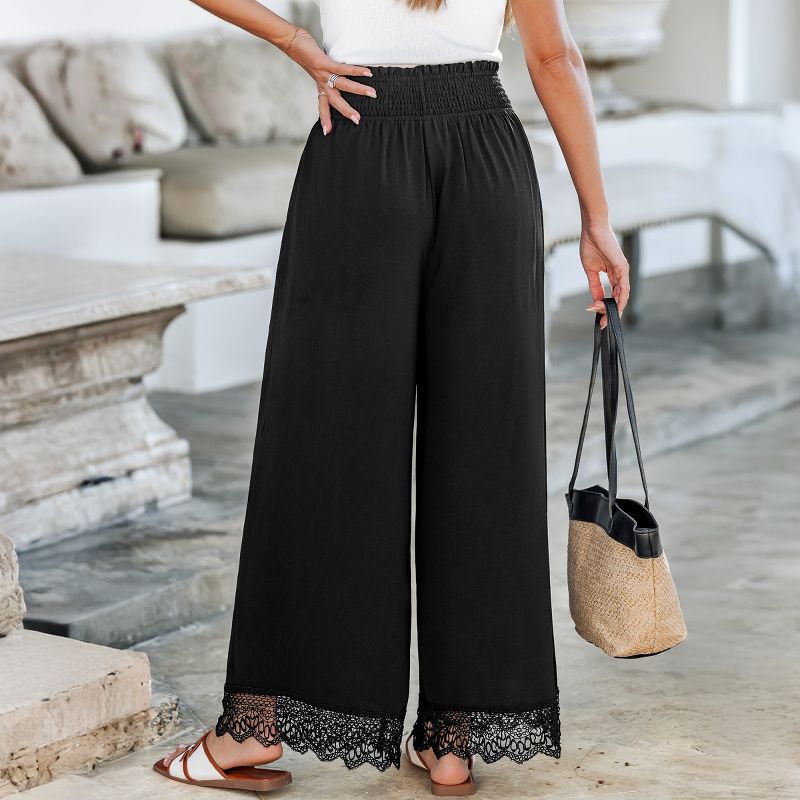 Women's Elegant Black Wide Leg Pants with Lace Trim - Cupshe-L-Black