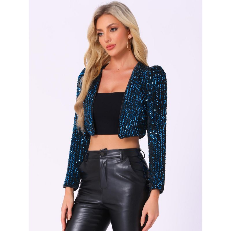 INSPIRE CHIC Women's Sequin Long Sleeve Open Front Party Cropped Jacket Small Black Blue