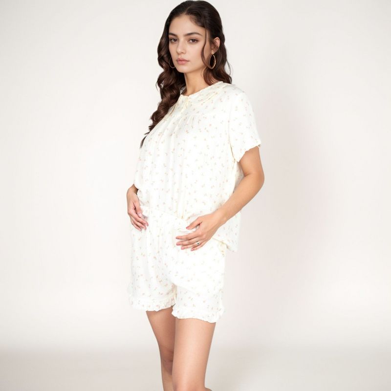 Anna-Kaci Lounge Women's Ditsy Floral Pajama Lounge Set with Ruffle Hem Shorts and Pintuck Top - Medium, Light Beige