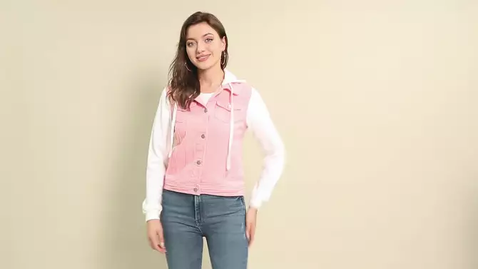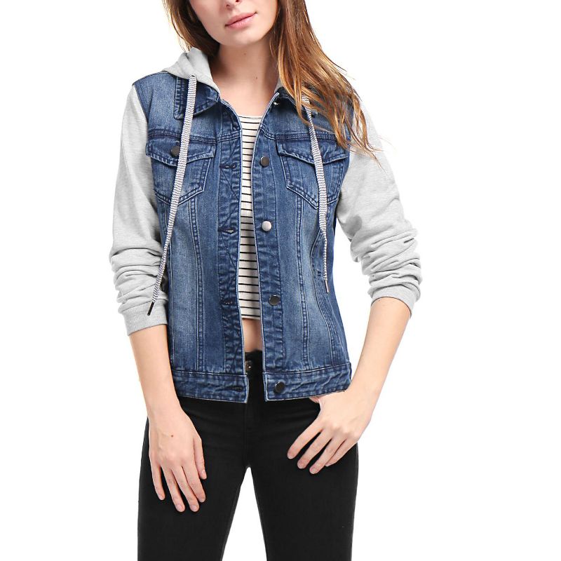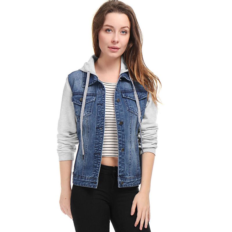 INSPIRE CHIC Women's Regular Fit Layered Drawstring Hood Denim Jacket with Pockets Dark Blue Medium