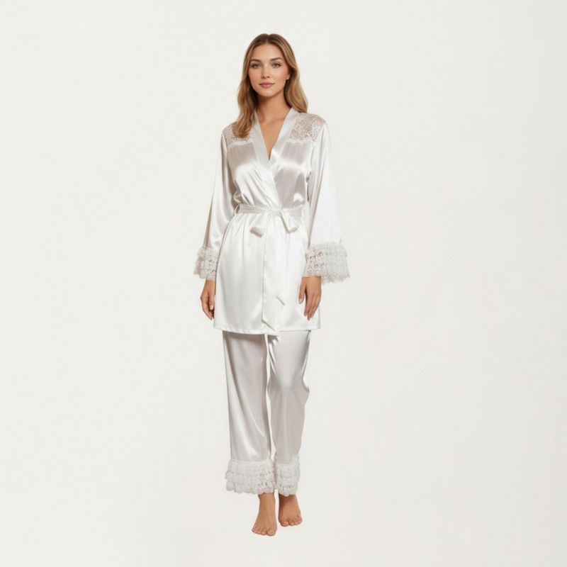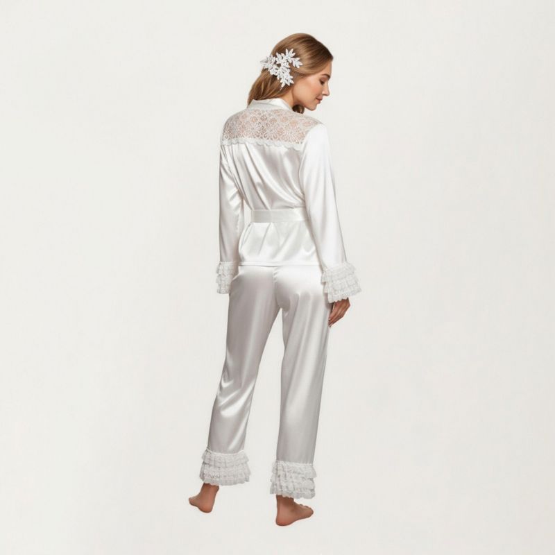 Anna-Kaci Lounge Women's 2-Piece Set Satin Lace Shoulder Long Sleeve Top with Ruffle Cuff Pants - X Large, White