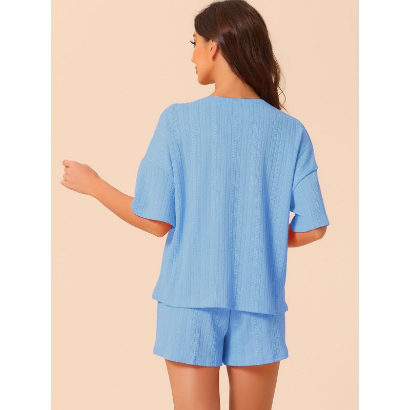 cheibear Women's Lounge Outfits Casual Round Neck Shorts Sleeves Ribbed Tops with Shorts Pajama Sets Blue Small