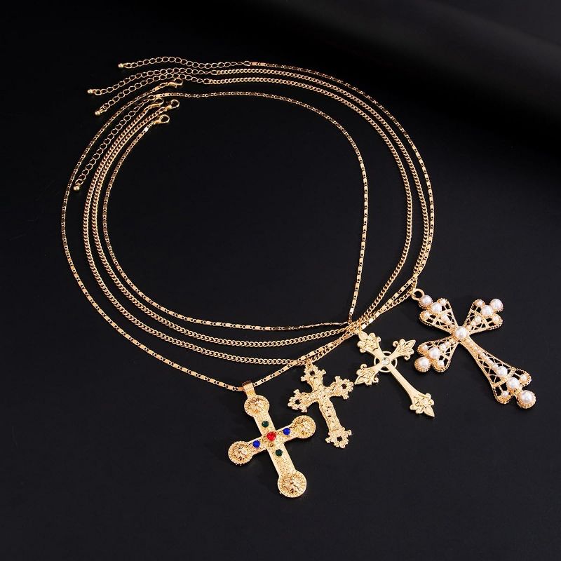 Summit Adventure Layered Cross & Pearl Necklace Set | Punk Grunge Y2K Statement Jewelry