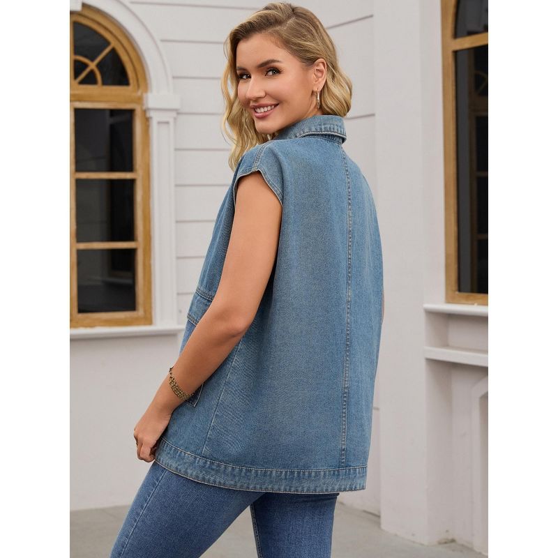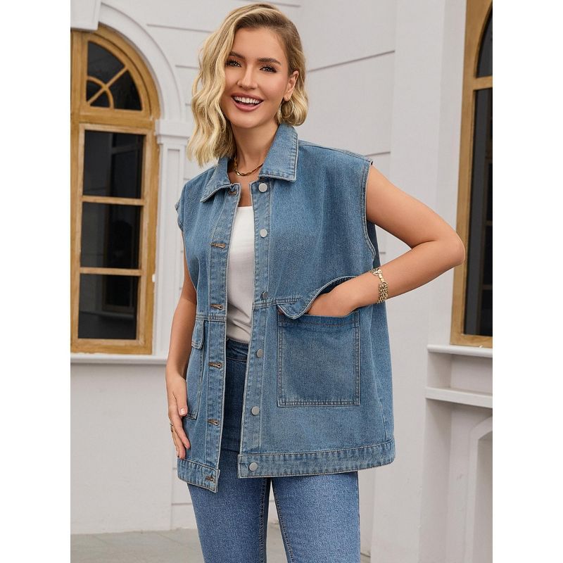 INSPIRE CHIC Women's Oversized Collared Button Down Sleeveless Long Denim Jacket Grey Blue Medium