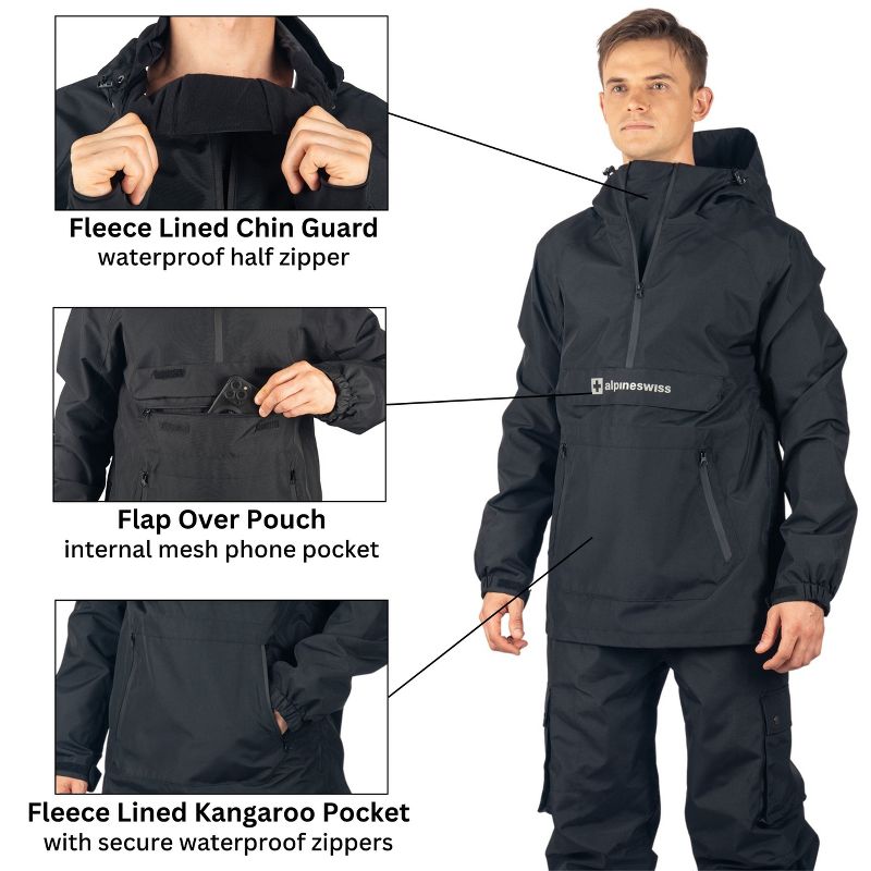 Alpine Swiss Mens Snowboard Jacket 10K Waterproof Hooded Ski Shell Anorak Windproof Pullover Winter Sport Coat BLK LRG