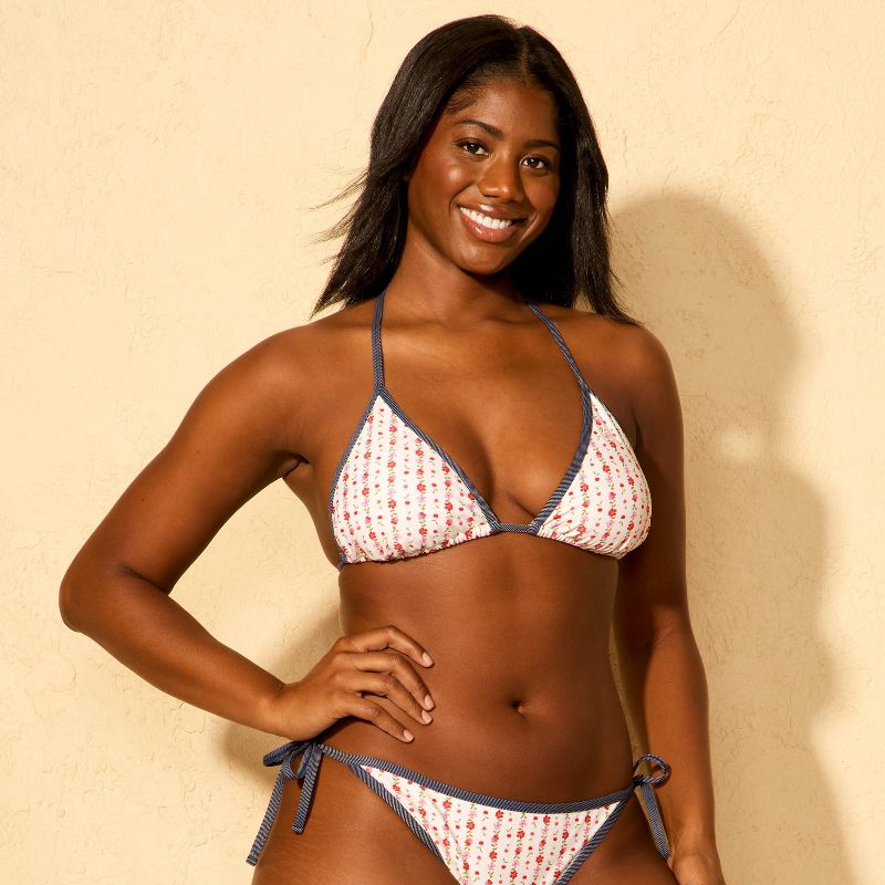 Women's Denim Print Contrast Binding Medium Coverage Triangle Bikini Top - Wild Fable™ Floral and Cherry Print XS