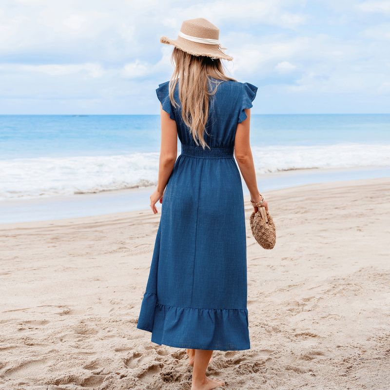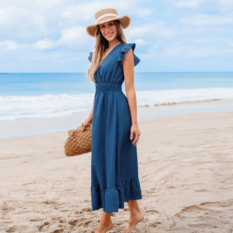 Women‘s Breezy Blue Smoked Waist Ruffle Sleeve Maxi Dress - Cupshe-M-Blue