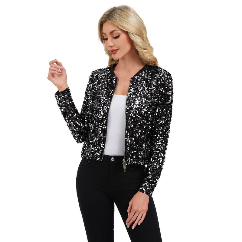 Anna-Kaci Women's Sequin Bomber Jacket with Zipper Front and Ribbed Trim - X Large, Black