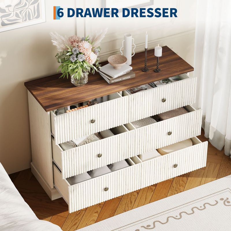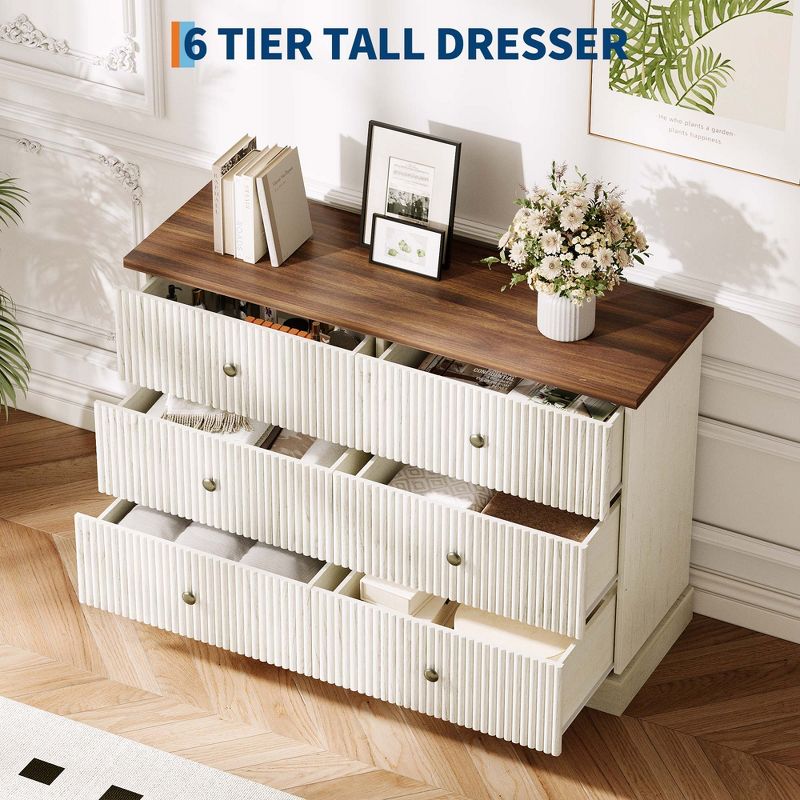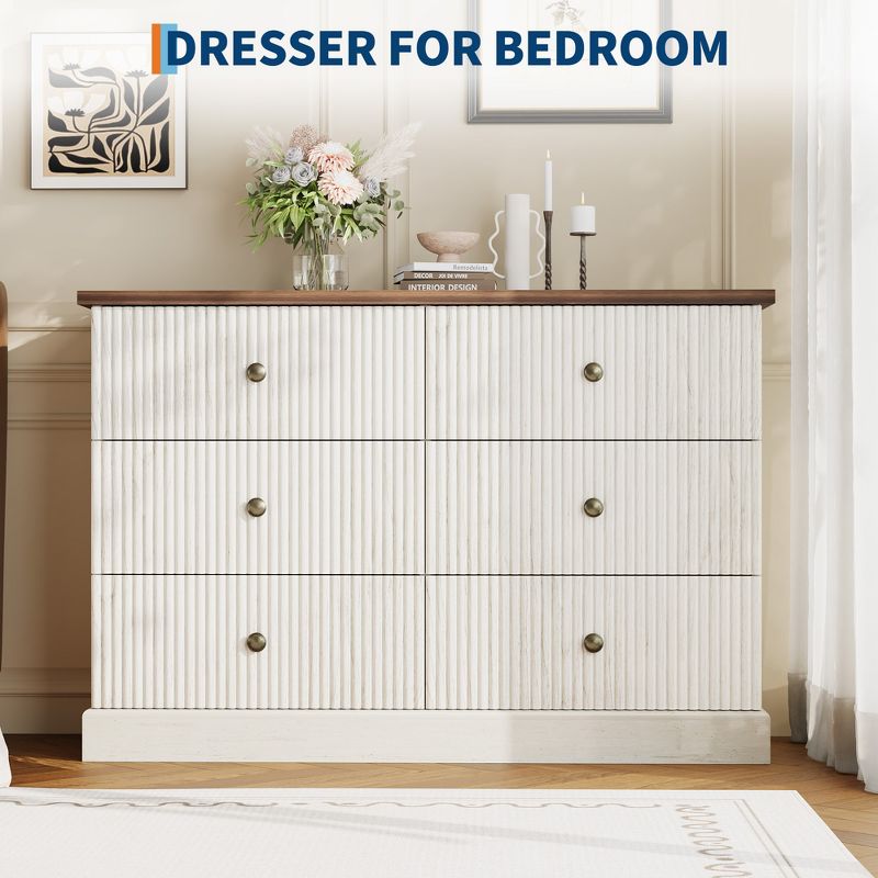 6 Drawer Dresser for Bedroom, Fluted Horizontal Chest of Drawers, 47" Wide Wood Dresser with Metal Handles, Modern Storage Dresser, White & Brown