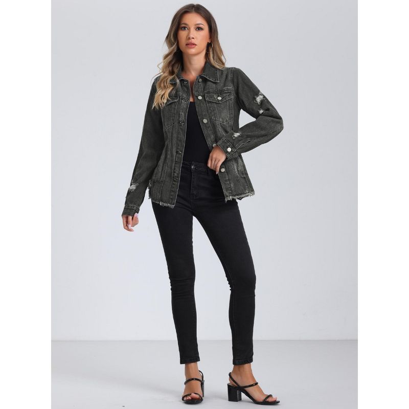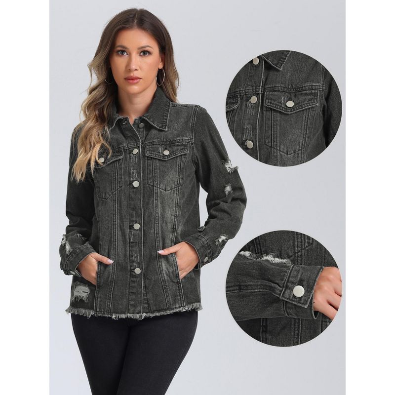 Allegra K Women's Frayed Washed Button Down Denim Jacket with Pockets Black Small