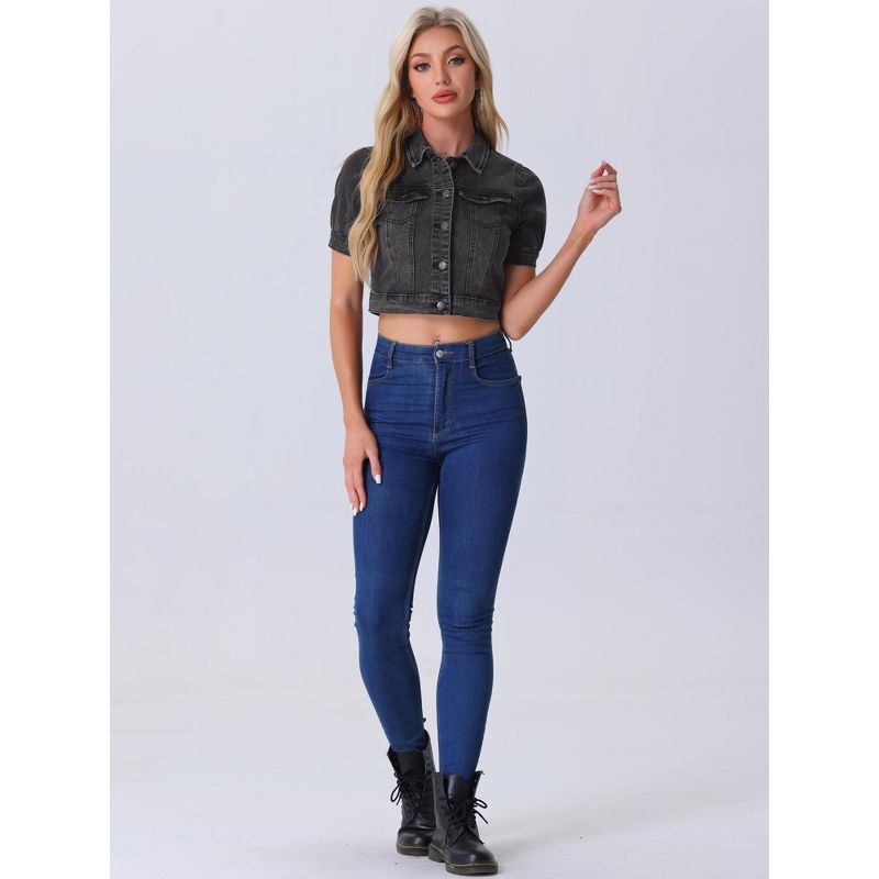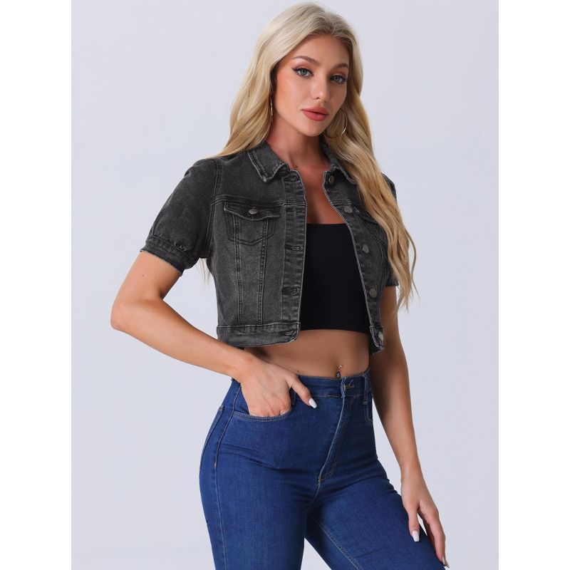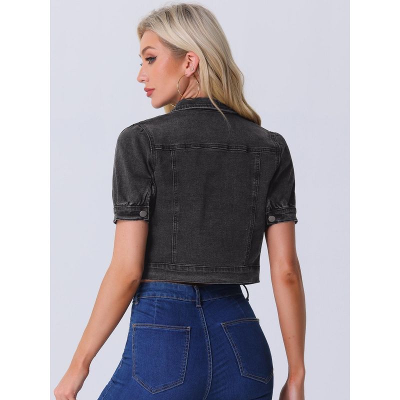 Allegra K Women's Casual Point Collar Button Down Puff Sleeve Crop Denim Jackets Medium Dark Gray