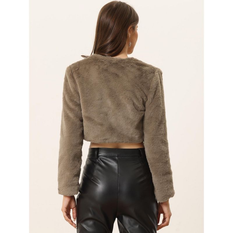 Allegra K Women's Cropped Open Front Collarless Faux Fur Jacket Dark Khaki Large