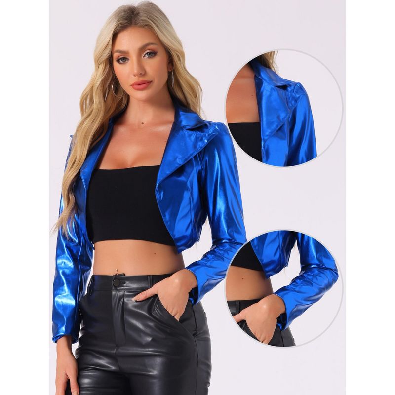INSPIRE CHIC Women's Long Sleeve Lapel Crop Shiny Party Metallic Jacket Blue Medium