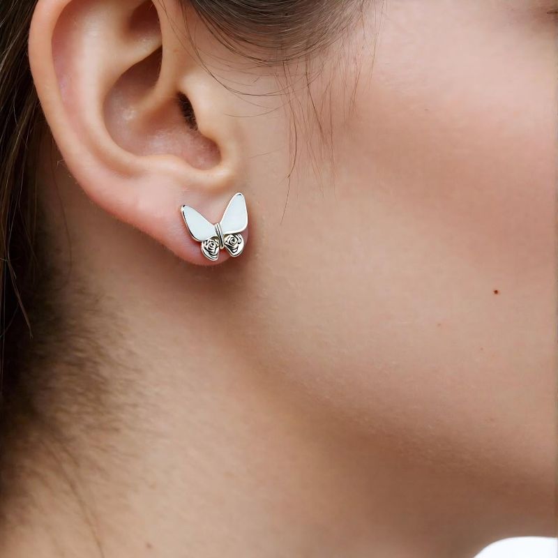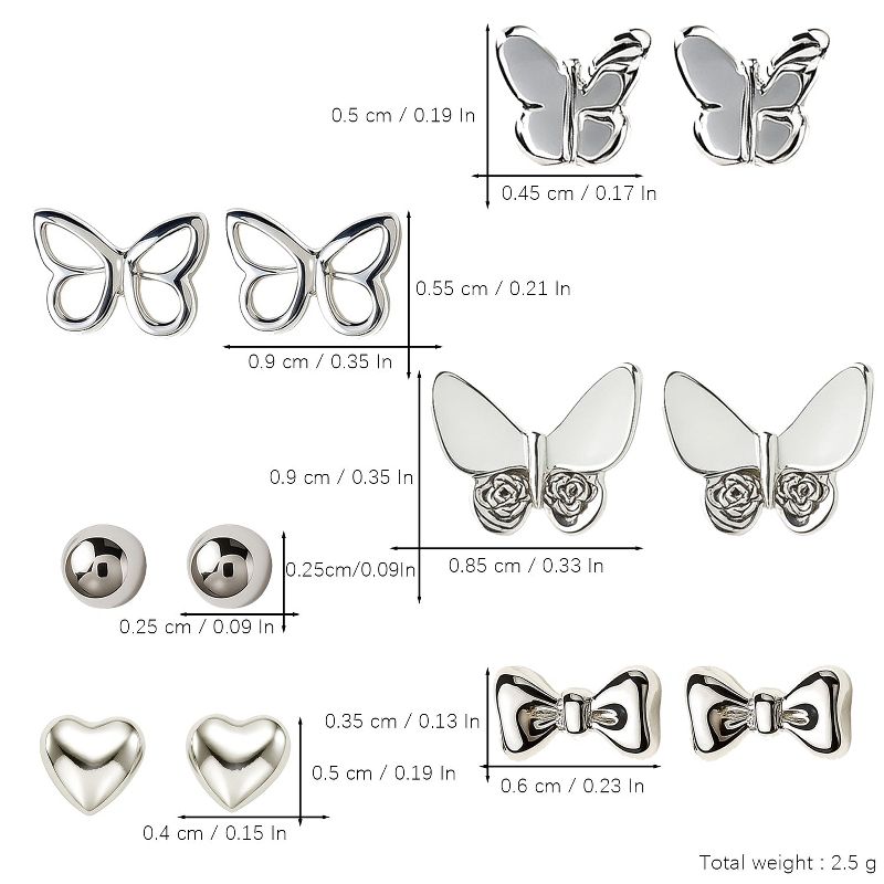 6-Pair Women's Stud Earrings Set, Silver-Tone Butterfly, Bow, Heart & Round Designs, Modern Style
