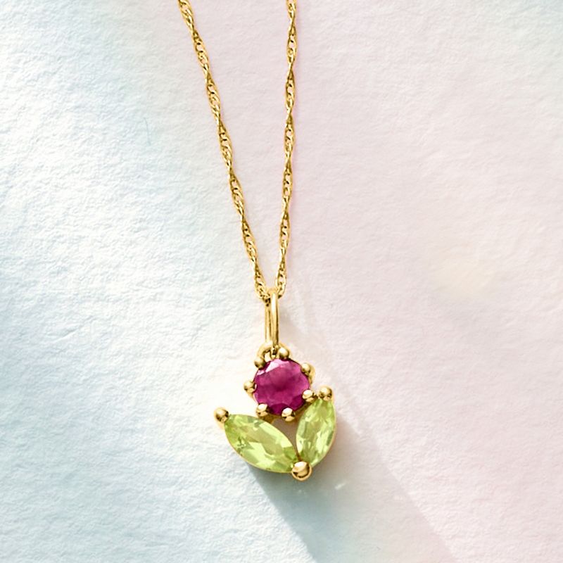 Pure Collection by Ross-Simons 0.20 Carat Rhodolite Garnet and .30 ct. t.w. Peridot Flower Pendant Necklace in 14kt Yellow Gold Size 16