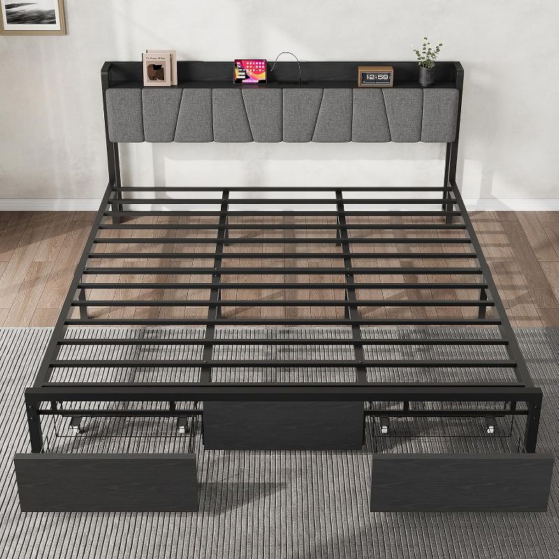 Platform bed frame with 2 storage drawers – upholstered headboard, sturdy metal bed slats, no seasonal box required, modern bedroom furniture, black.