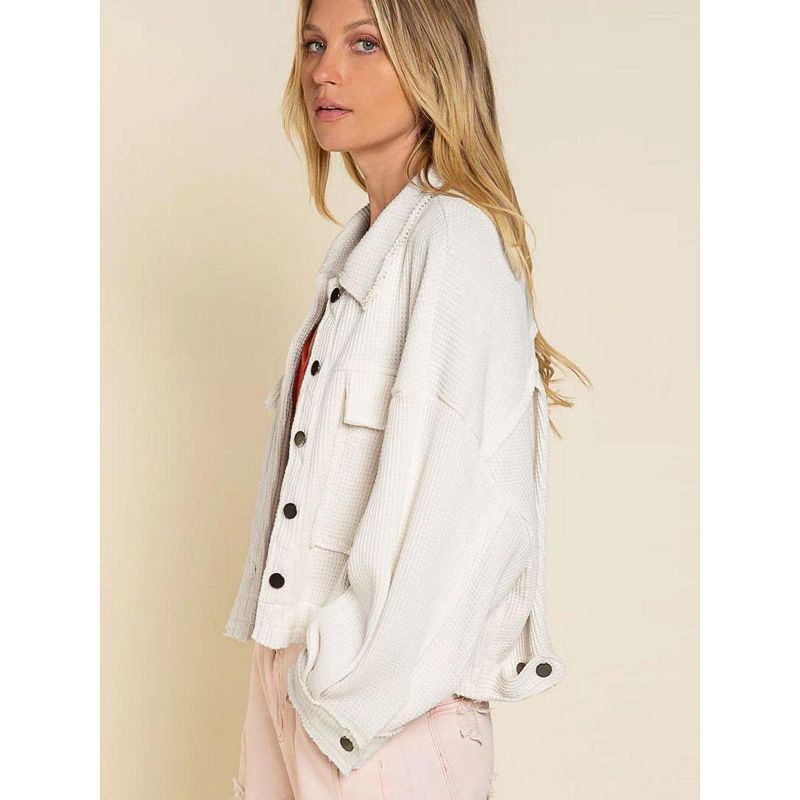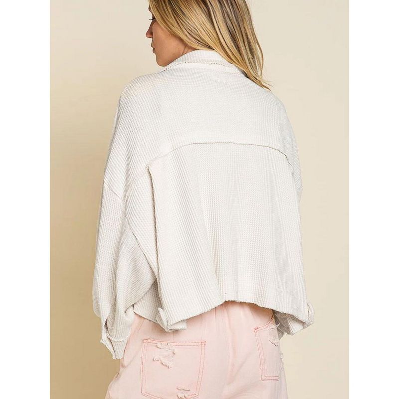 Women's Waffle Knit Cropped Jacket - Button-Front Shacket with Chest Pockets, Dropped Shoulders & Raw Hem,Creamy whiteL