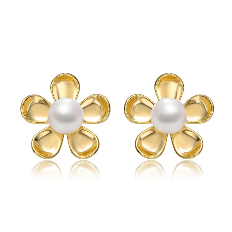 Guili Sterling Silver 14K Gold Plated Earrings with White Freshwater Pearl, Featuring a Beautiful Blooming Daisy Flower Stud Design
