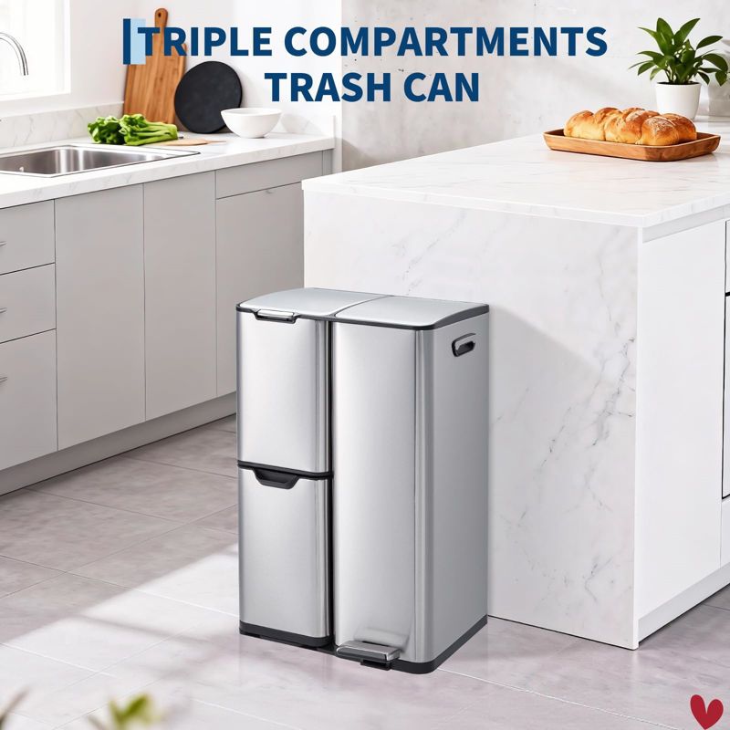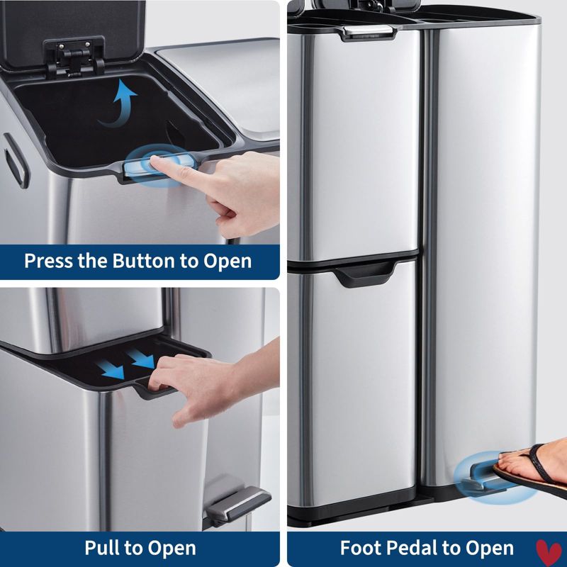 Triple Compartment Stainless Steel Trash & Recycling Bin Combo ¨C 16 Gallon, Removable Inner Buckets, Collapsible Foot Pedal ¨C Step-On Garbage Can