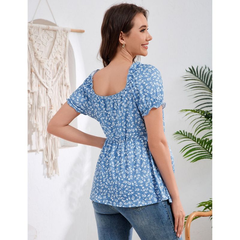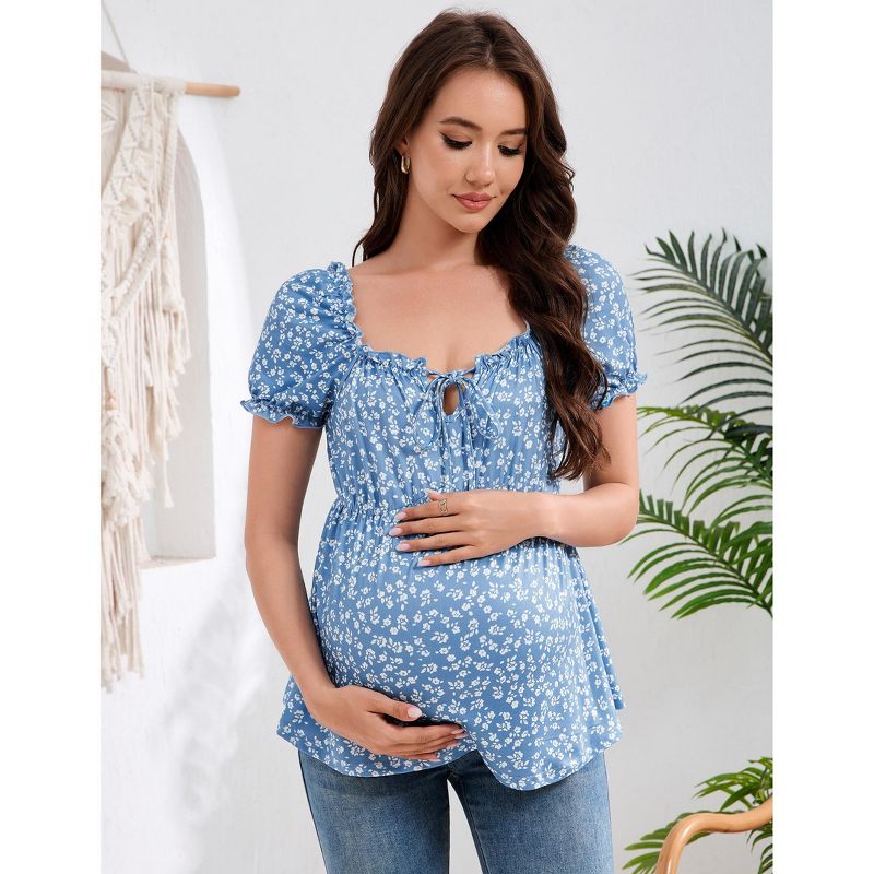 Coolmee Women's Maternity Square Neck Short Sleeve Peplum Tops Tie Front Summer Babydoll Top T Shirt Blue S