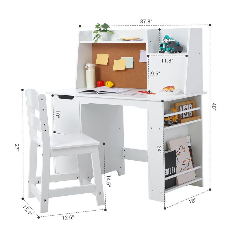 Wooden Kids Desk & Chair Set with Storage Shelf & Bulletin Board - White Study Table, Durable Writing Desk for Ages 3+
