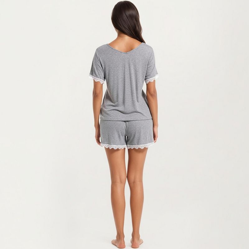 Anna-Kaci Lounge Women's Lace Trim Short Sleeve Pajama Set with Pocket Detail - X Large, Gray