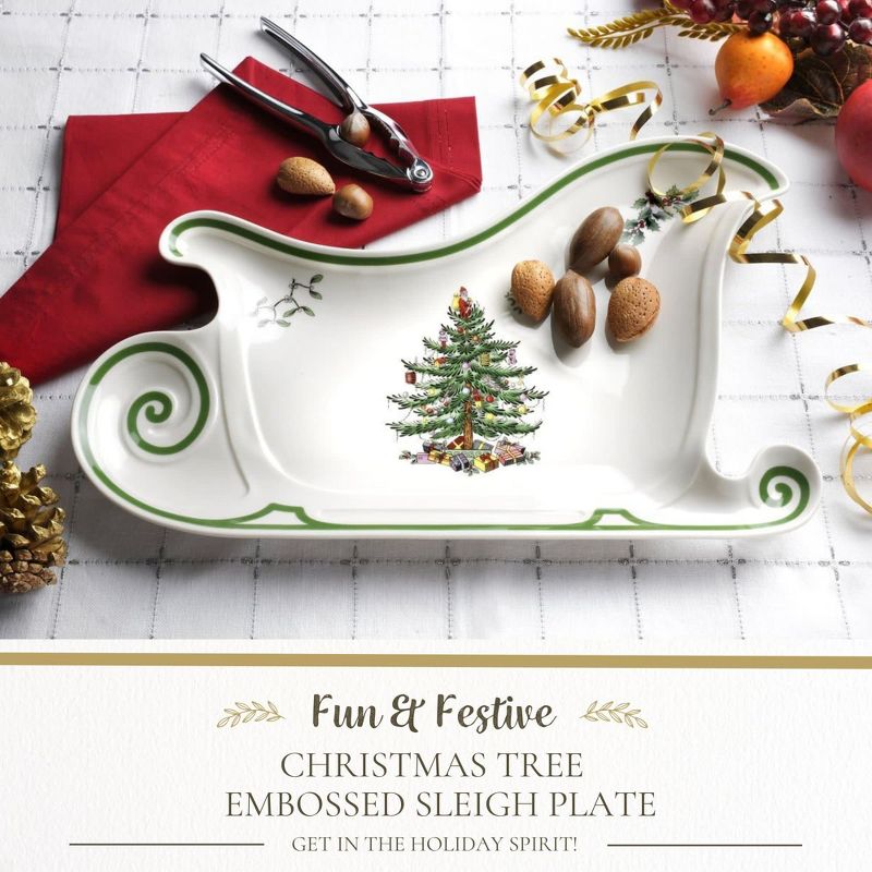 Spode Christmas Tree Embossed Sleigh Plate, 9" Serving Festive Serving Dish - Fine Porcelain Decorative Holiday Platter