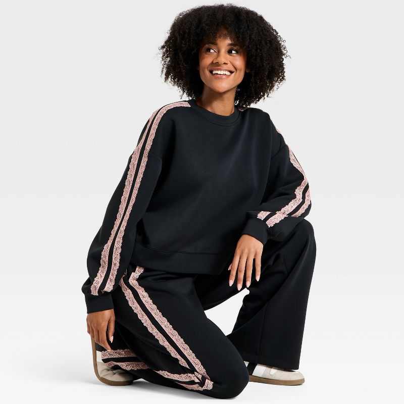 Women's Airy Sleek Lace Trim Crewneck Sweatshirt - All In Motion™ Black M