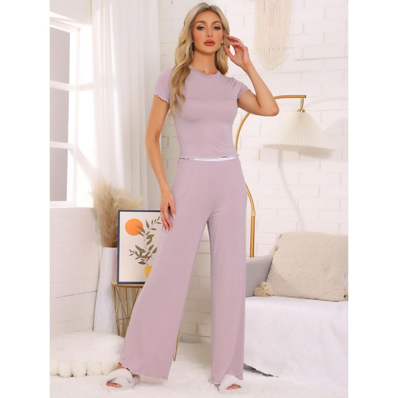 cheibear 2 Pcs Women's Knitted Short Sleeve Top Ruffled Long Wide Leg Pants Pajama Sets Medium Pink