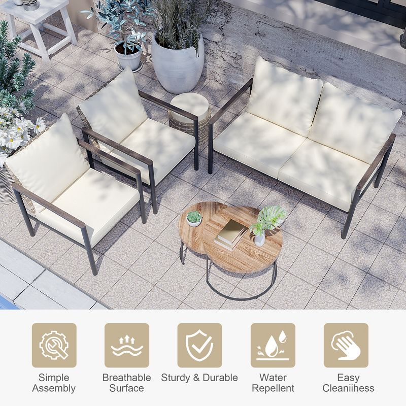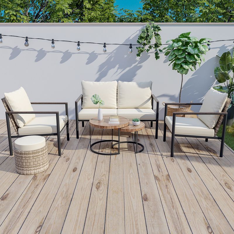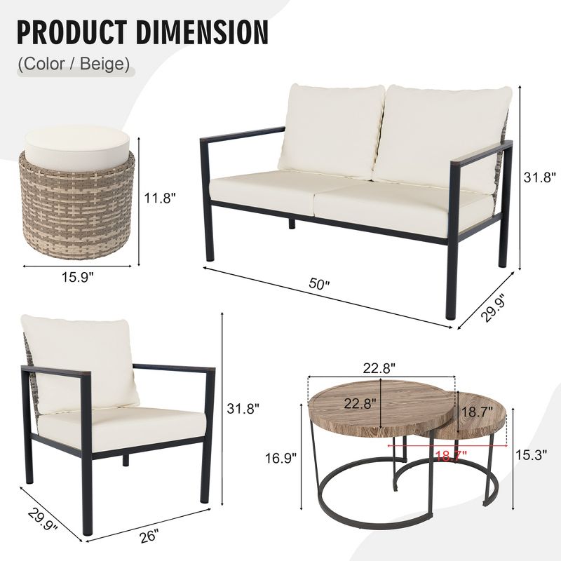 YARDSIGHT 5-Piece Patio Conversation Set with Loveseat, 2 Armchairs, Ottoman, and Nesting Coffee Tables ¨C Blue Cushions & Handwoven Rattan