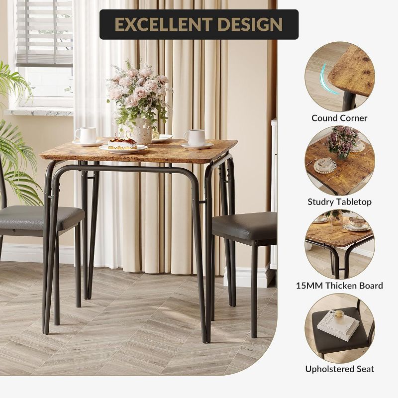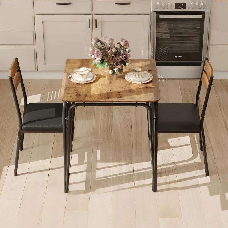 Jojoka Space-Saving 3-Piece Rectangular Dining Table Set for 2 with Upholstered Cushioned Chairs, Compact Kitchen and Dining Room Furniture, Brown