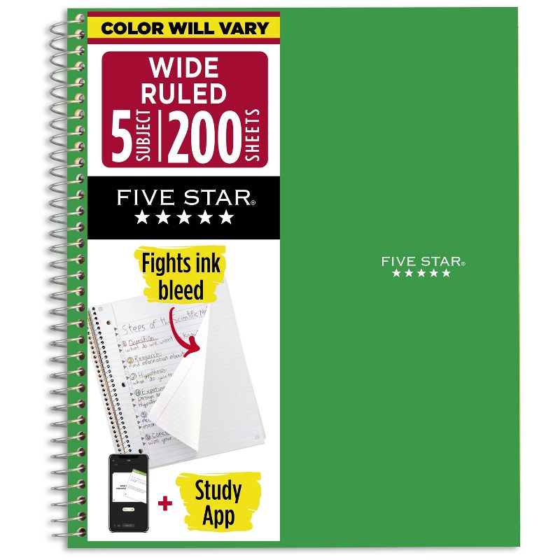 Five Star 200pg 5 Subjects Wide Ruled Spiral Notebook (Colors May Vary): Multi Subject, Perforated Pages, Flexible Cover