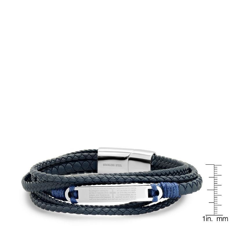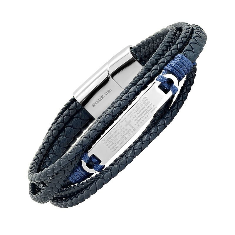 Steeltime Men's layered navy blue leather with stainless steel Our Father prayer id bracelet