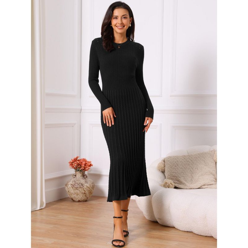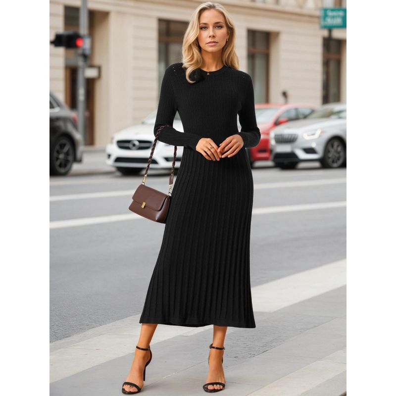 INSPIRE CHIC Women's Crewneck Knit Long Sleeve Midi Ribbed A-Line Sweater Dress Black Small
