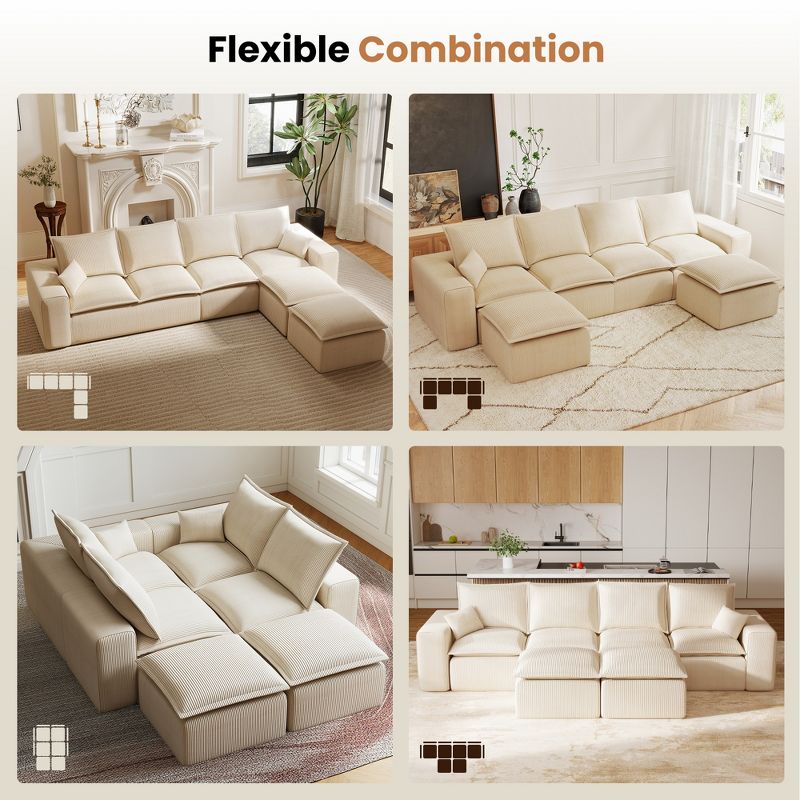Kayamas 137'' Modular Sectional Sofa, 4 Seater U Shaped Corduroy Couch with Movable Ottoman for Living Room Beige