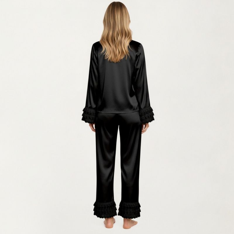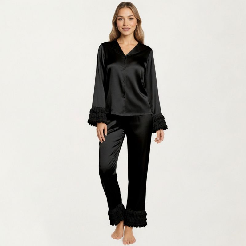 Anna-Kaci Lounge Women's Long Sleeve Pajama Set with Soft Button Front Top and Ruffled Cuff Trim Straight-Leg Pants - Small, Black