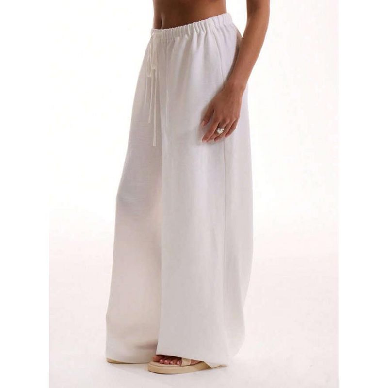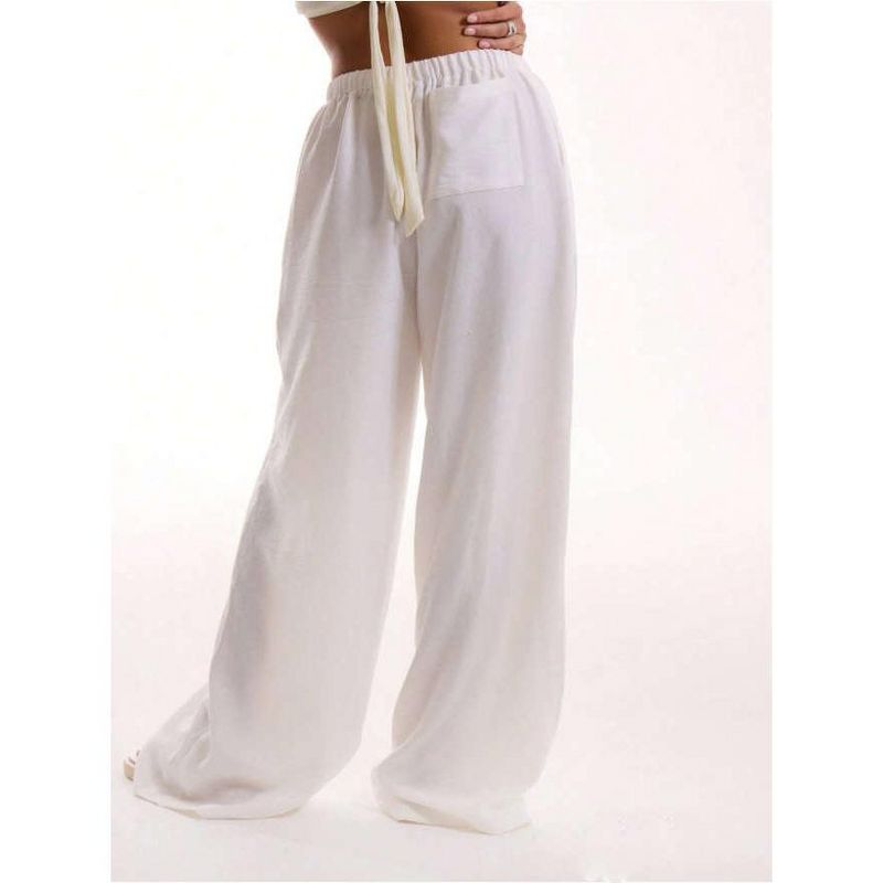 Womens Mid Rise Elastic Waist Wide Leg Pants Side Pocket Drawstring Casual Trousers White XL
