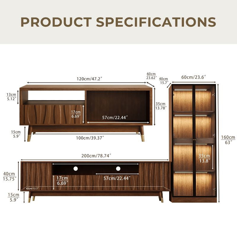ATJafurn Entertainment Center, Mid-Century Modern Living Room Furniture Wood TV Stand and Coffee Table Set with Glass Display Cabinet