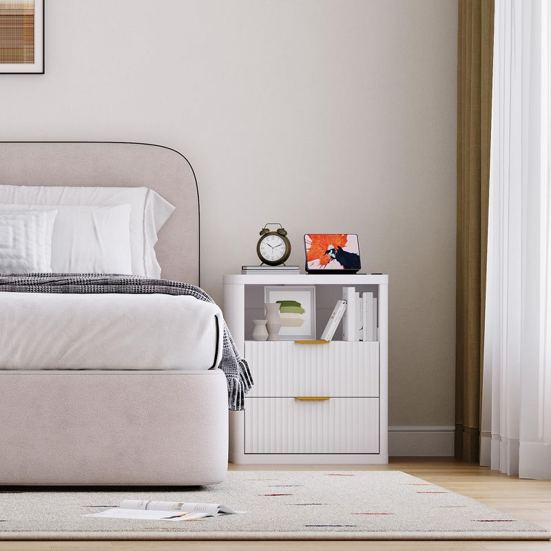 Fluted Nightstand with Charging Station — Mid-Century Modern Bedside Table with Metal Handles, Rounded Corners for Safety, and Multi-Functional