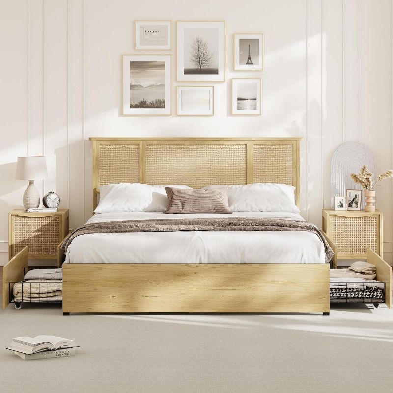 Queen Platform Bed Frame with Natural Rattan Cane Headboard, Metal Frame & Wood Slats, Boho Bedroom Furniture, No Box Spring Needed, Easy Assembly