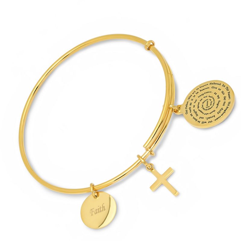Steeltime Ladies 18k gold plated stainless steel bracelet with our father, faith, and cross charms. Color Options: Silver, Gold