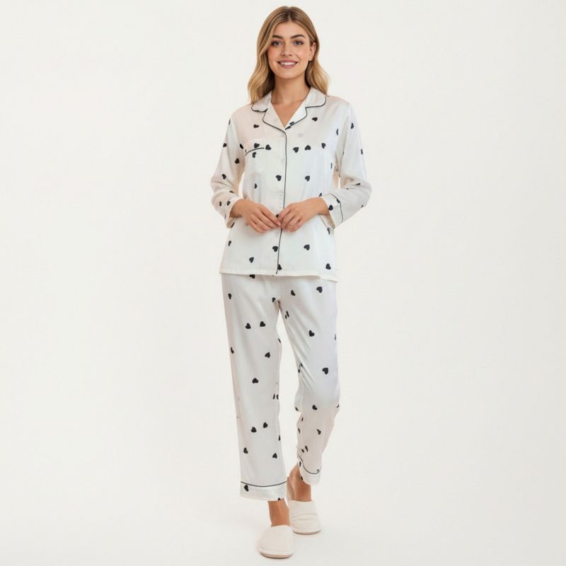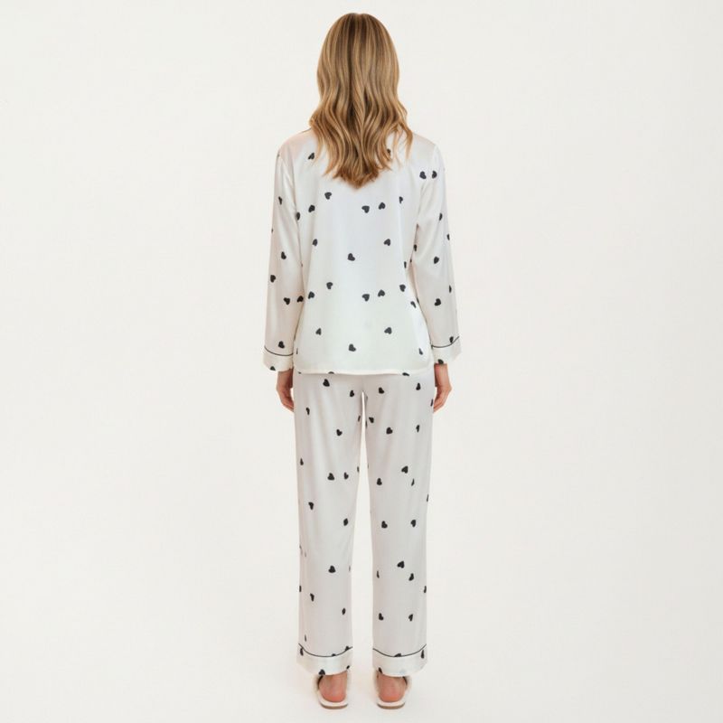 Anna-Kaci Lounge Women's 2-Piece Set Satin Valentine Heart Print Pajama Top with Contrast Piping Matched with Relaxed Straight-Leg Pants - Medium,